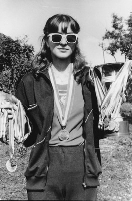 Slijepa atletičarka s osvojenim medaljama na natjecanju.